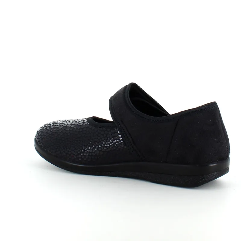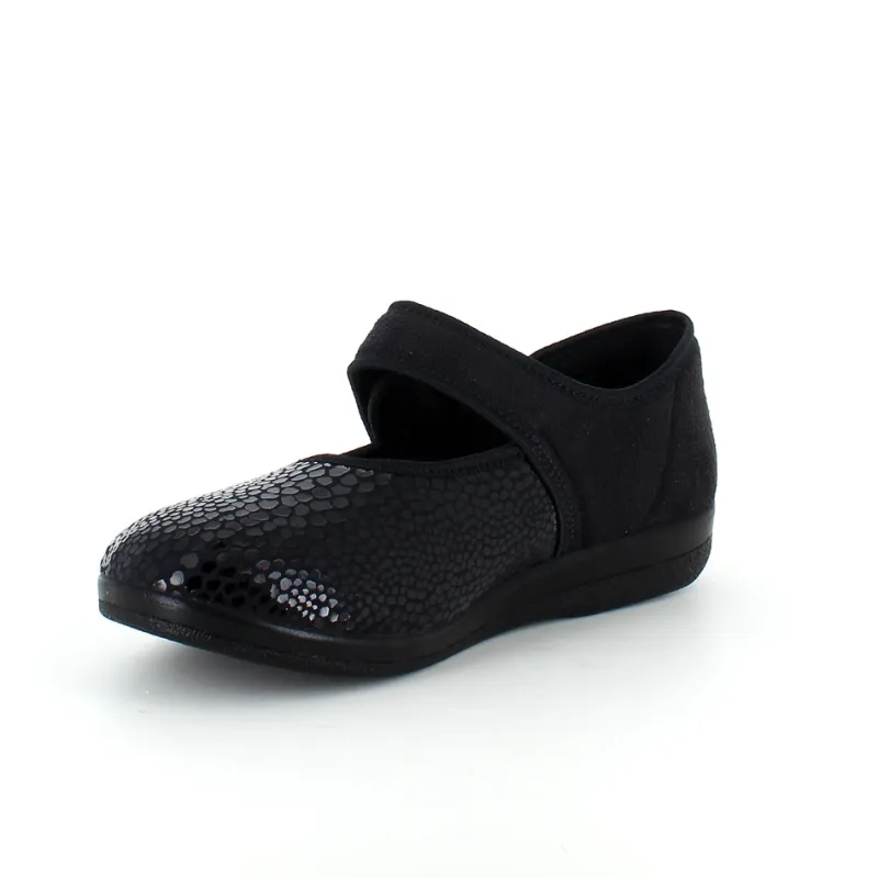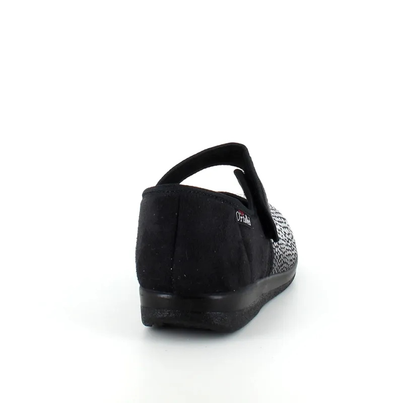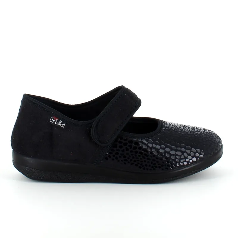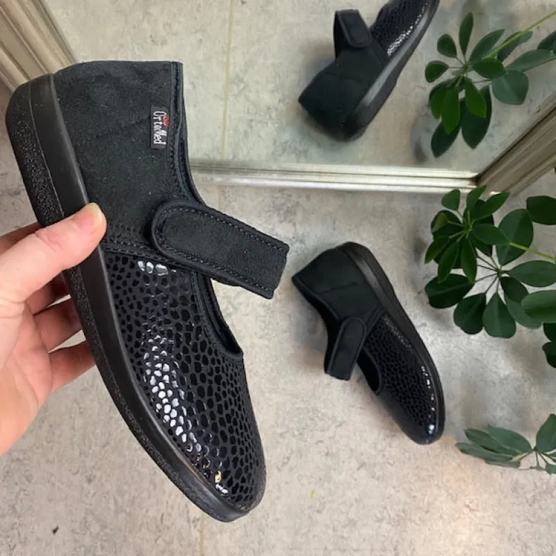 Bred ortopædisk sko i sort med velcro omkring ankel. Forfoden har glat elastisk stof som giver forfoden ekstra plads.