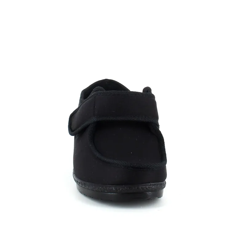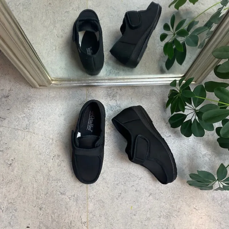 Bred ortopædisk sko i sort med velcro omkring ankel. Forfoden har glat elastisk stof som giver forfoden ekstra plads.