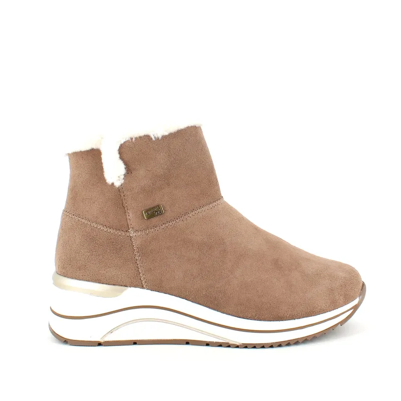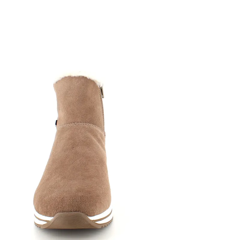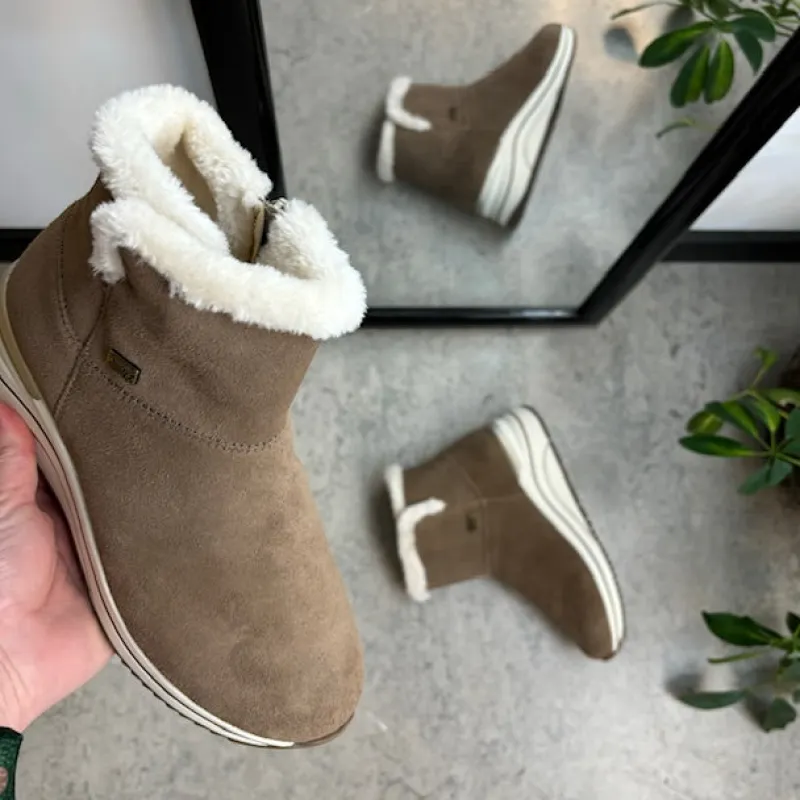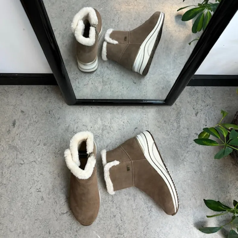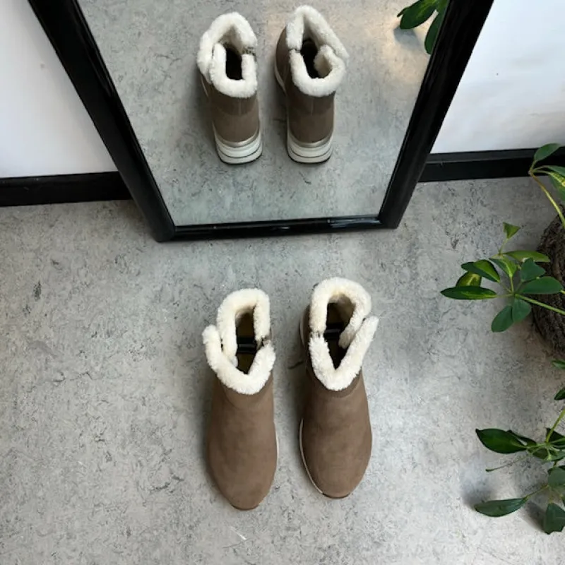 Kort brun remontestøvle med uldfor er en stilfuld og komfortabel vinterstøvle lavet af læder, med en blød ruskindsoverdel, der tilføjer et luksuriøst præg.
