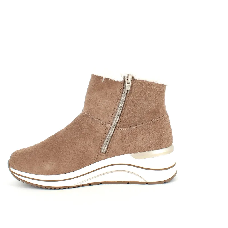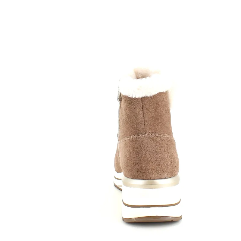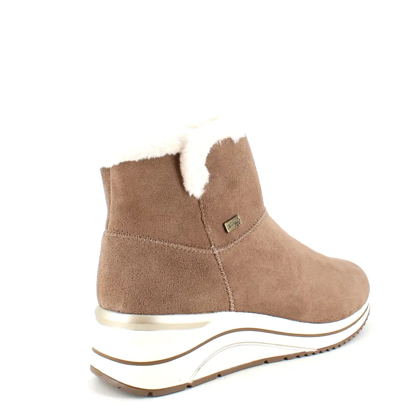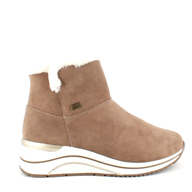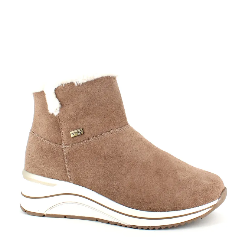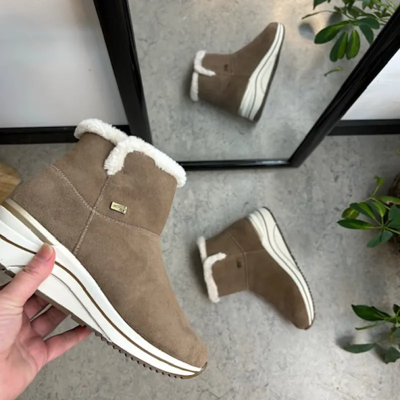 Kort brun remontestøvle med uldfor er en stilfuld og komfortabel vinterstøvle lavet af læder, med en blød ruskindsoverdel, der tilføjer et luksuriøst præg.