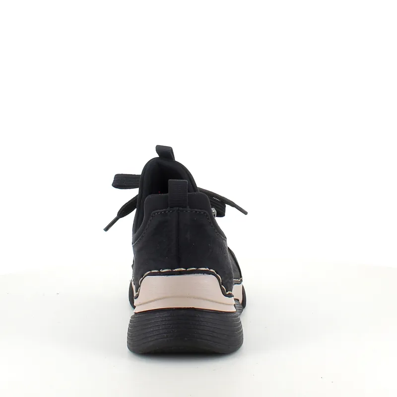 Disse flotte Rieker sneakers i sort til damer – enkel i design med smarte detaljer som pyntelynlås og elastisk åbning, der gør skoen nem at tage af og på. Snørebåndet kan justeres for optimal pasform.
