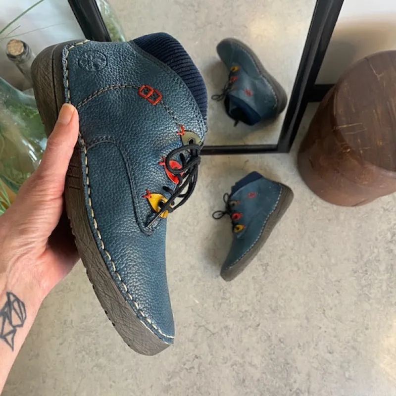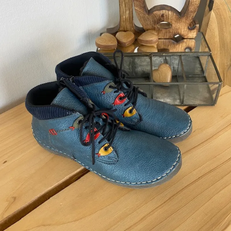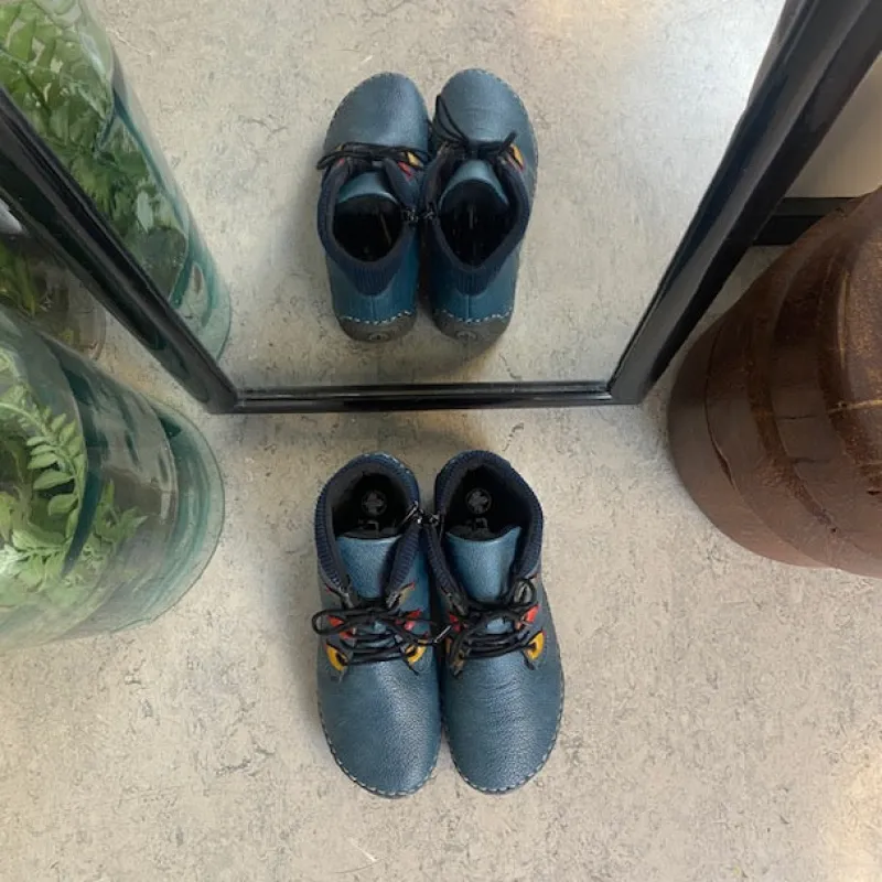 Støvlen er fremstillet i imiteret blåt skind, der giver et flot og levende udtryk, samtidig med at materialet føles blødt og behageligt mod foden.