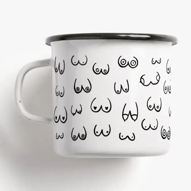 Denne hvide emaljekop er dekoreret med et sjovt og kreativt print af forskellige bryster, illustreret i enkel stregtegning. Den klassiske retrostil med sort kant giver koppen et tidløst udtryk, mens det humoristiske motiv gør den til et oplagt valg, hvis du ønsker at kombinere funktionalitet med et smil på læben.