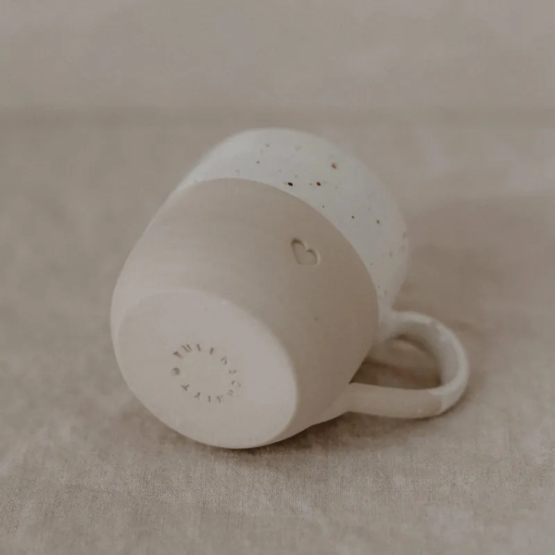 Denne smukke keramik kop kombinerer enkelthed og charme i et tidløst design. Den er todelt i et naturligt beige look forneden og en glaseret hvid top med små rustikke prikker, som giver et unikt og håndlavet udtryk. Som ekstra detalje er der et lille indgraveret hjerte på forsiden – en fin og kærlig detalje, der gør koppen helt særlig.
