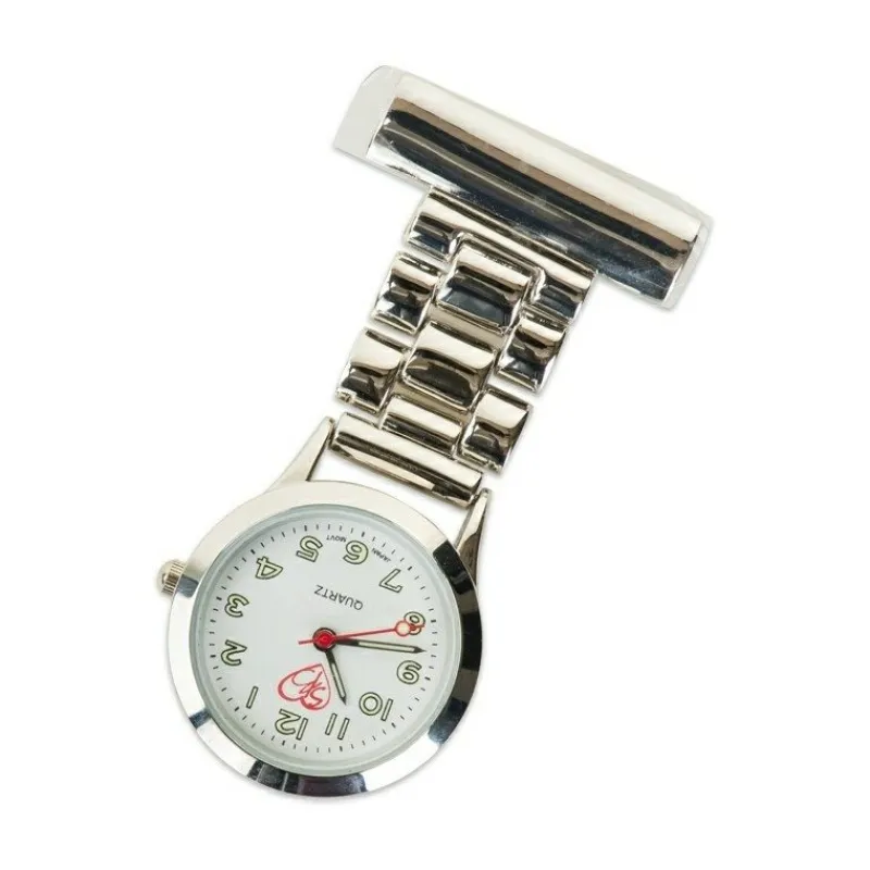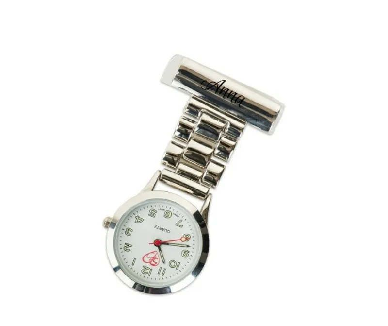 Bredt sygeplejeur i stål som er 6 cm langt og 3,5 cm bredt. Uret fås både i guld og stål.