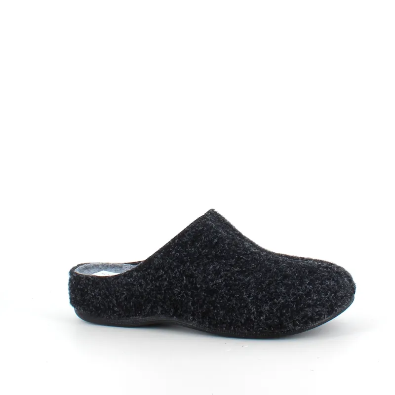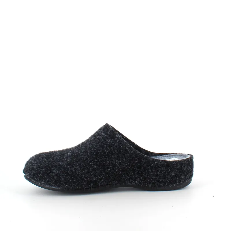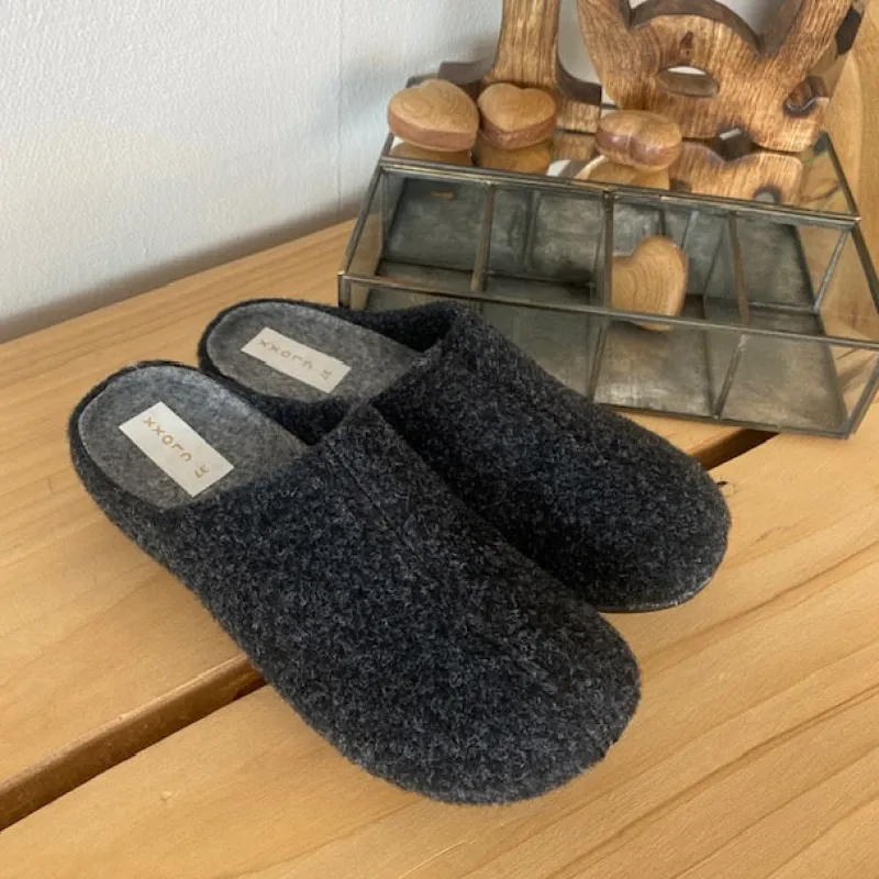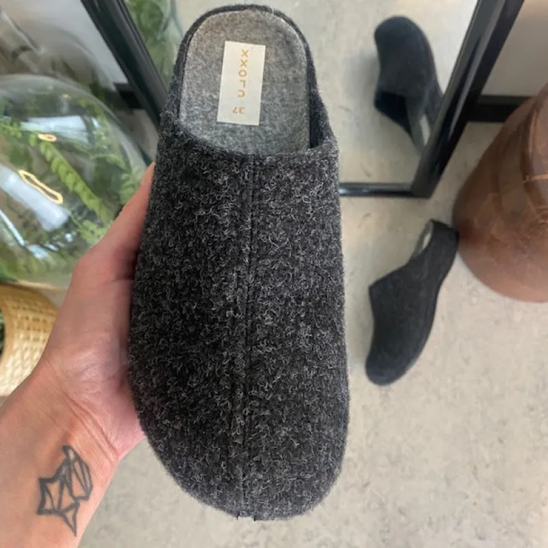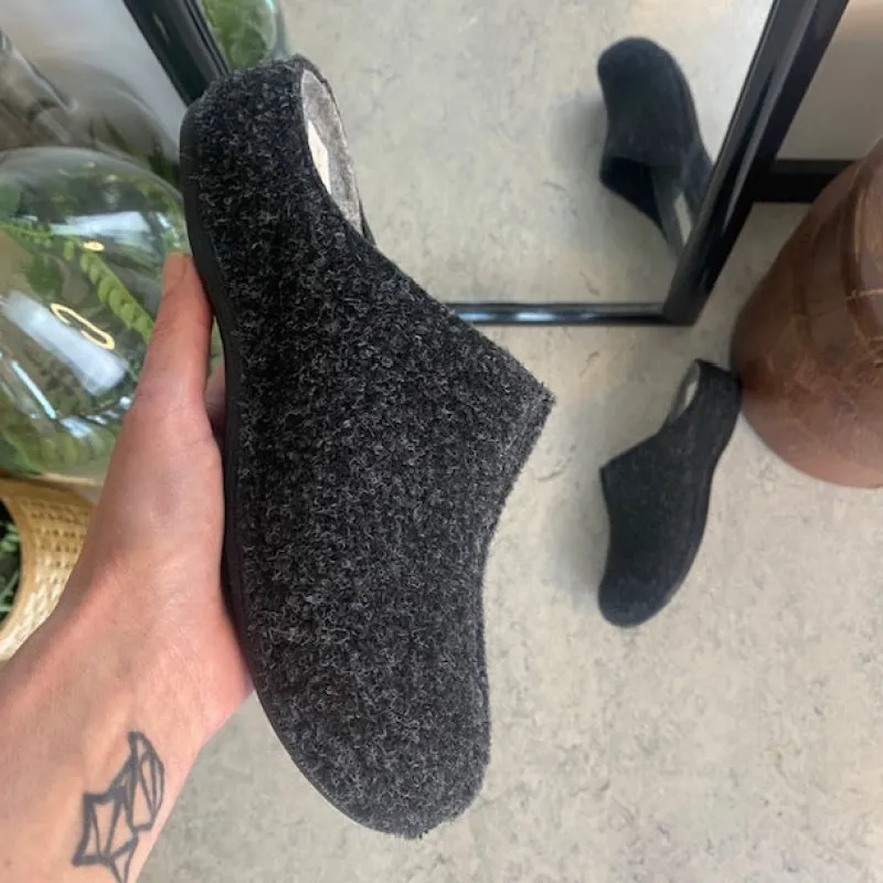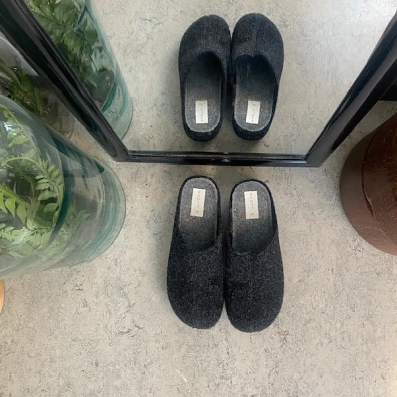 Mørkegrå filthjemmesko, som giver dig komfort og varme.