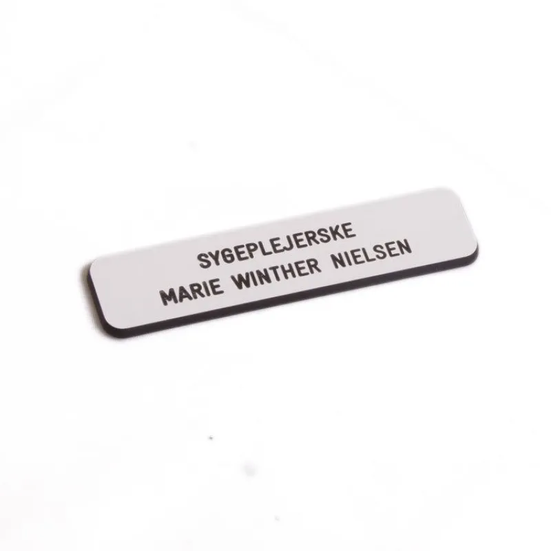Navneskilt firkantet med afrundede kanter, hvid overflade med sort skrift.