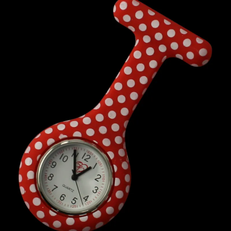 Farverigt, rødt silikone sygeplejeur med hvide polkapletter.
