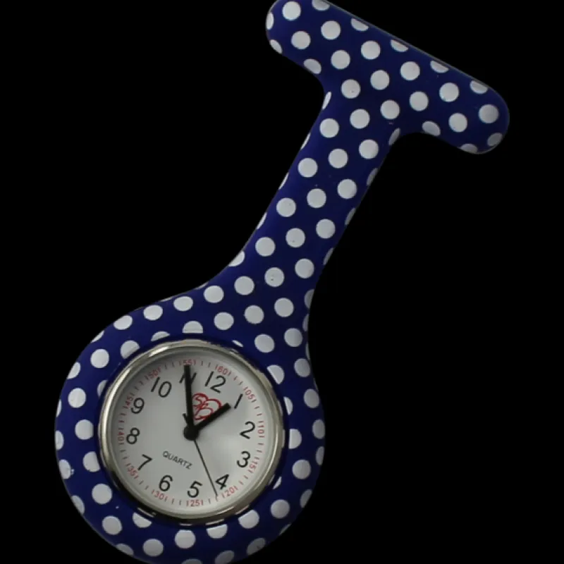 Flot mørkeblå silikone sygeplejeur med hvide polkapletter.