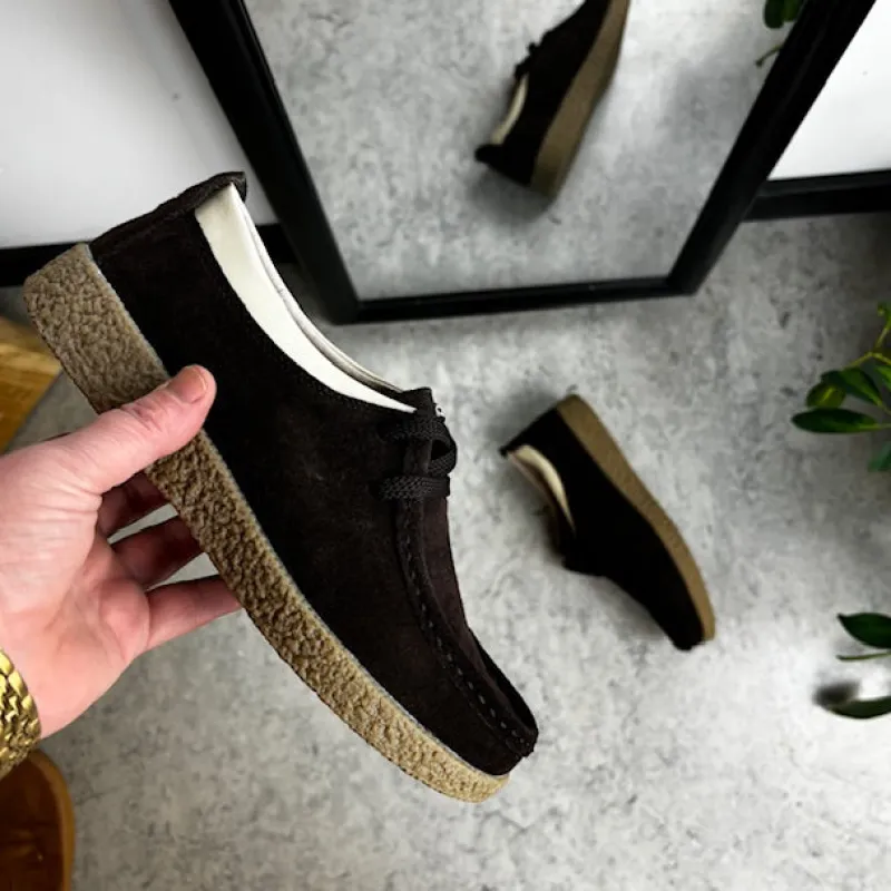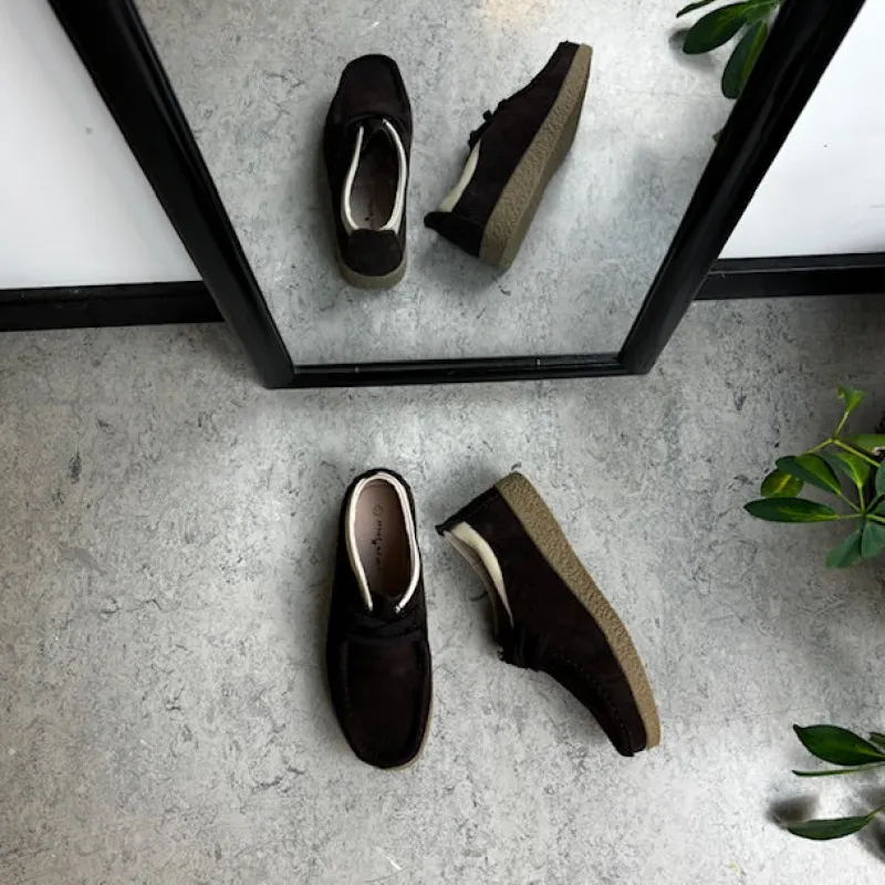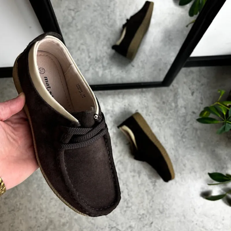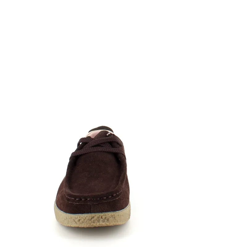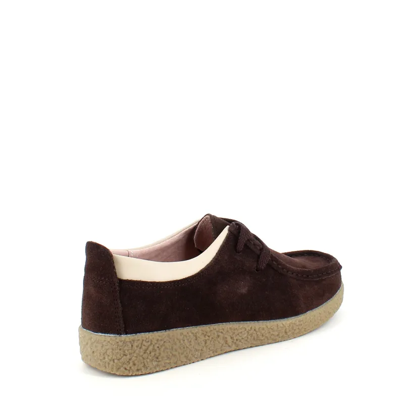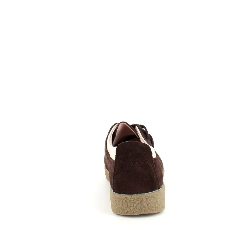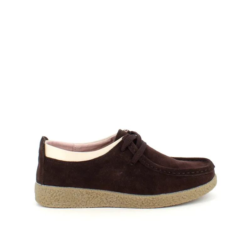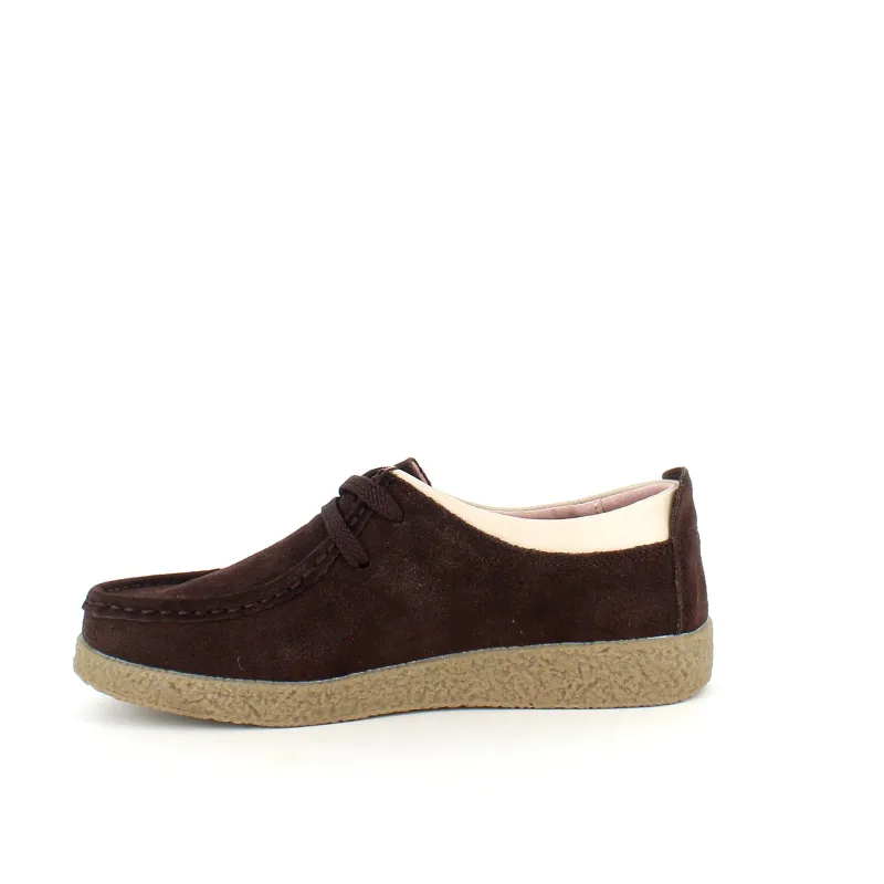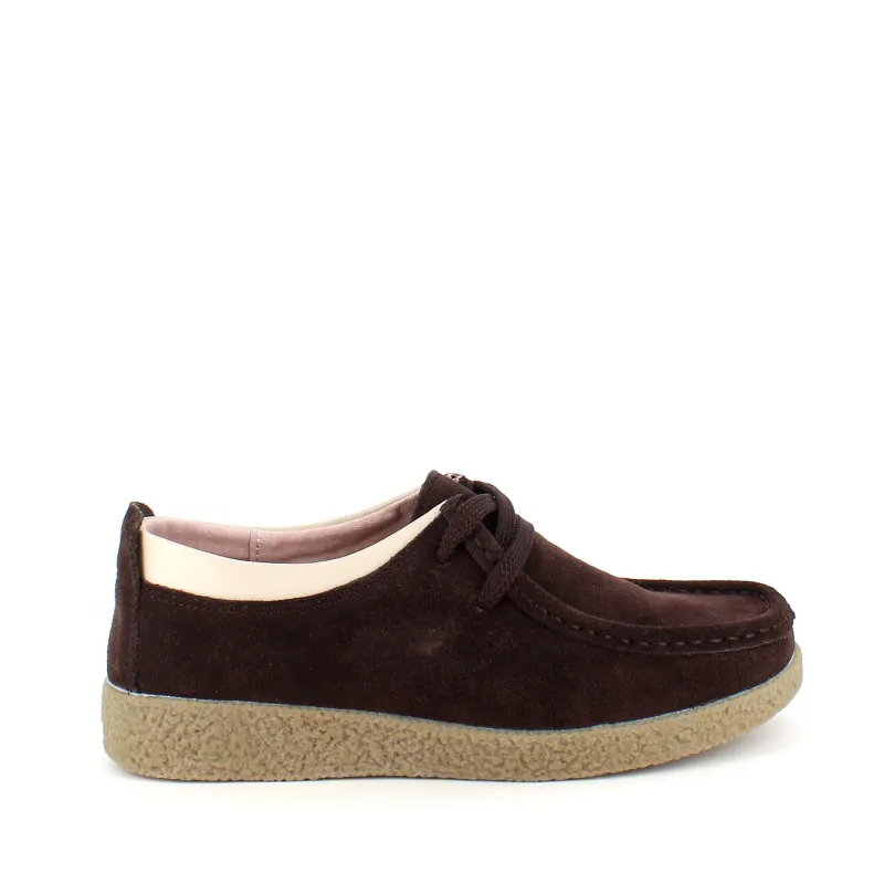 Brun ruskindsko med gummisål har en elegant design med en beige læderkant ved åbningen. Skoen har snørelukning og en tydelig syning i overdelen, som giver et stilfuldt udseende. Den indvendige skum sål er beklædt med læder for komfort, og modellen er almindelig med en bredde på 7.5 cm i størrelse 37. Ydersålen er lavet af rågummi, hvilket giver god stødabsorbering og fleksibilitet. Skoen fås i størrelserne 36-41 og i mange forskellige farver.