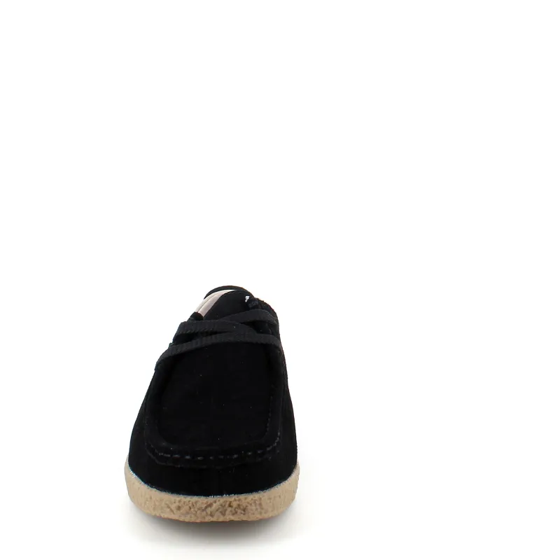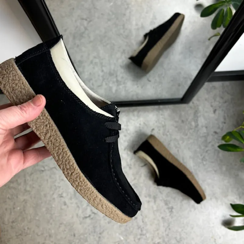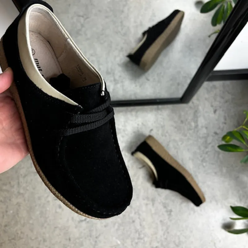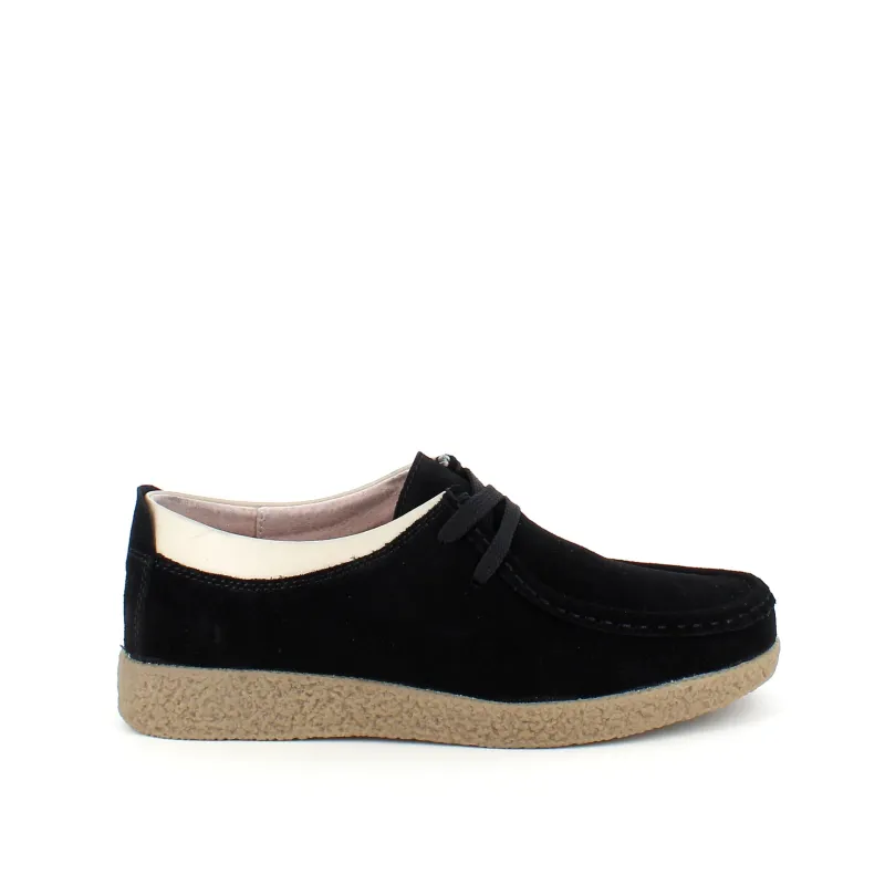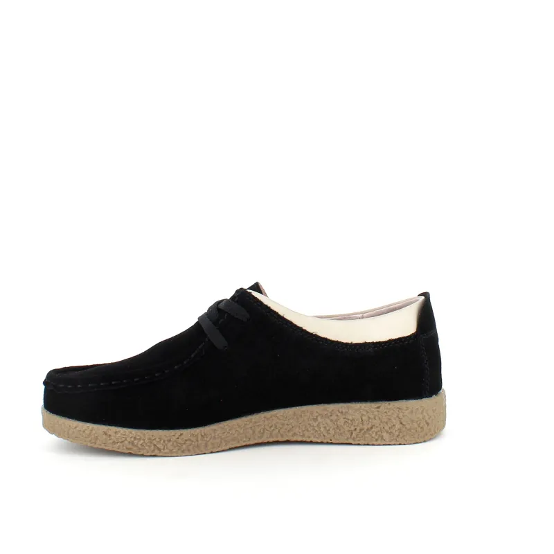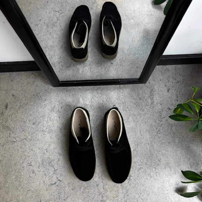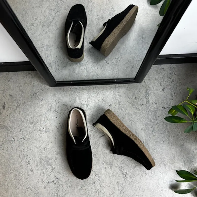 Sort ruskindsko med gummisål har en elegant design med en beige læderkant ved åbningen. Skoen har snørelukning og en tydelig syning i overdelen, som giver et stilfuldt udseende. Den indvendige skum sål er beklædt med læder for komfort, og modellen er almindelig/smal med en bredde på 7.5 cm i størrelse 37. Ydersålen er lavet af rågummi, hvilket giver god stødabsorbering og fleksibilitet. Skoen fås i størrelserne 36-42 og i mange forskellige farver.