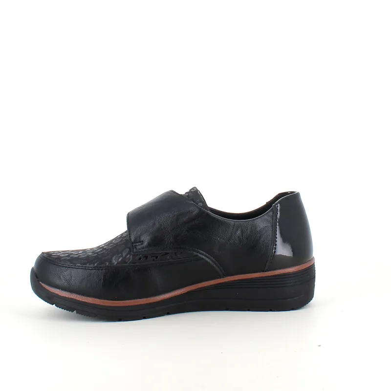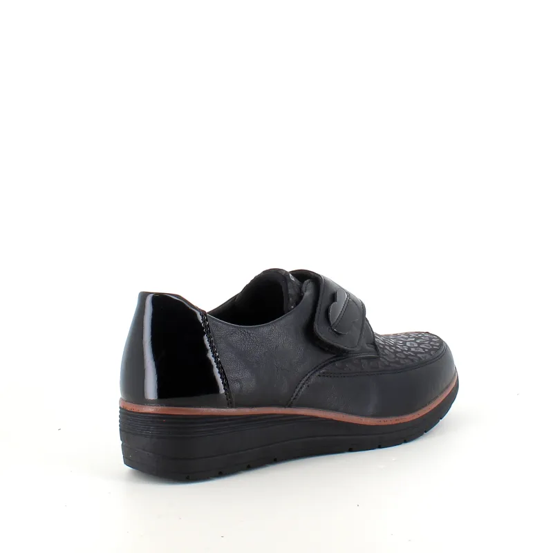 Skoen har velcrolukning som gør den nem at tage af og på.