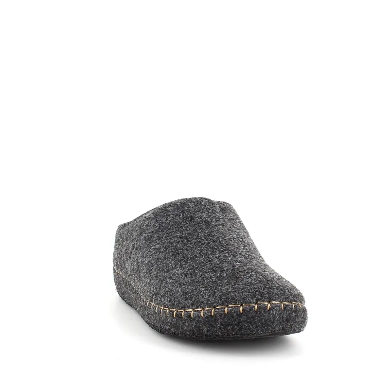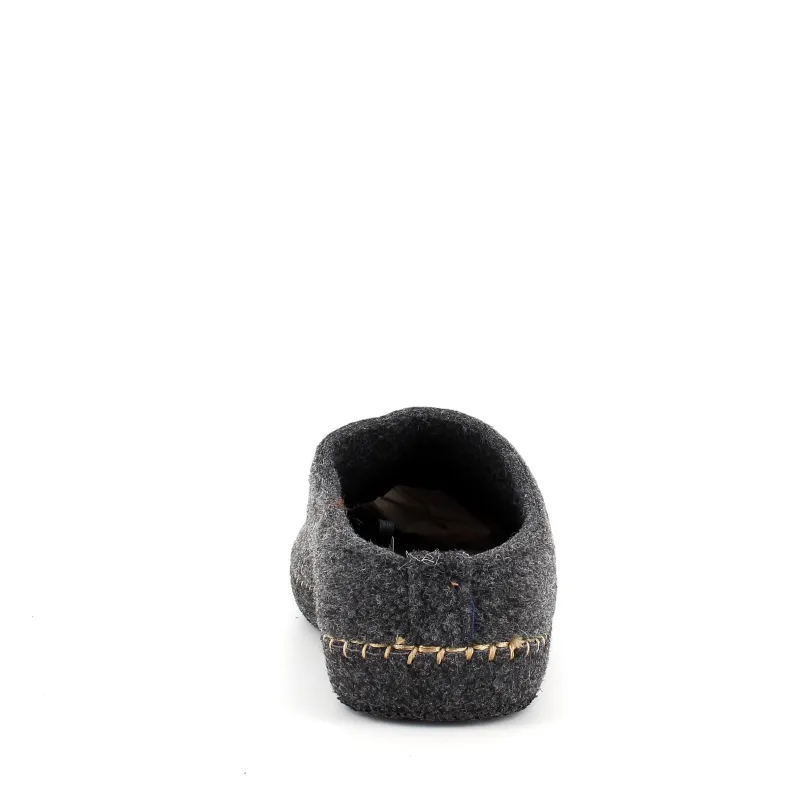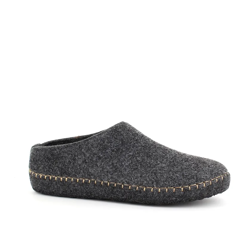 Mørk grå sutsko i filtet materiale.