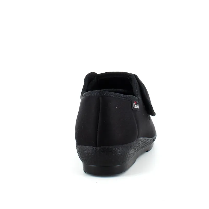 Bred ortopædisk sko i sort med velcro omkring ankel. Forfoden har glat elastisk stof som giver forfoden ekstra plads.