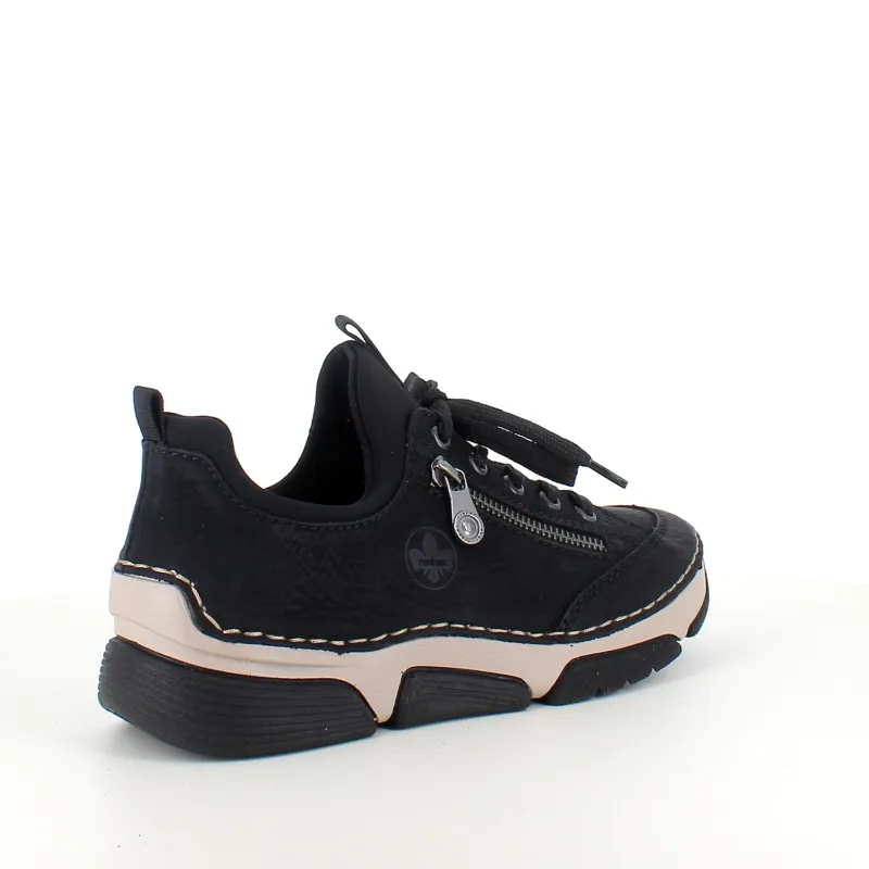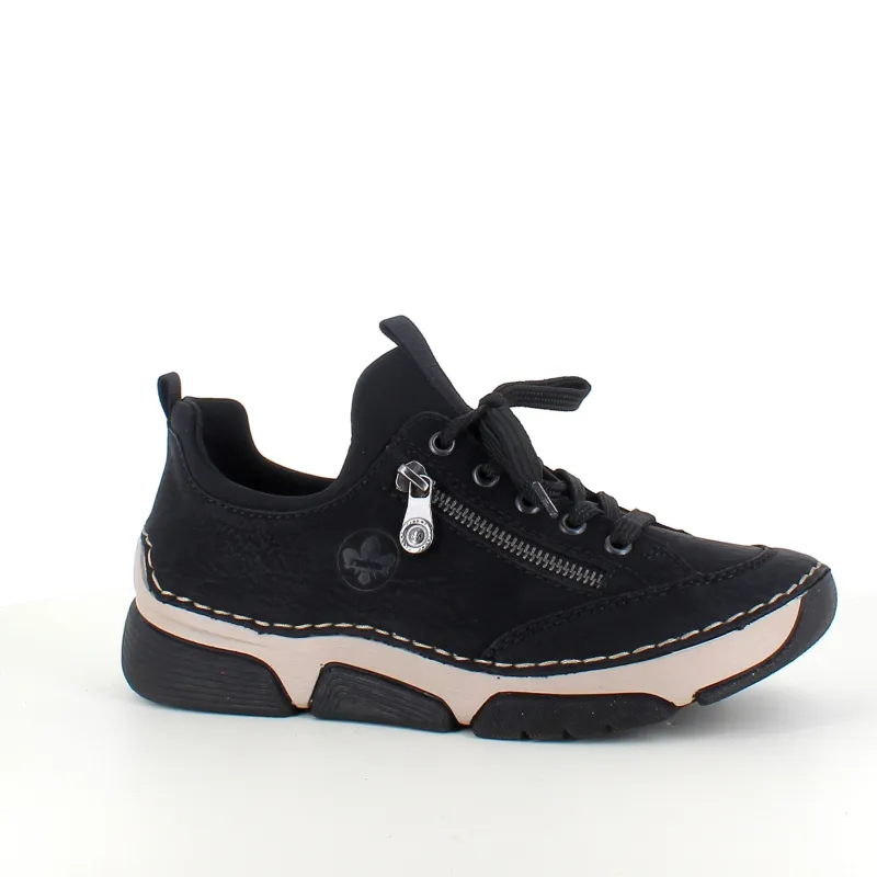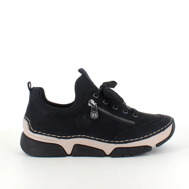 Disse flotte Rieker sneakers i sort til damer – enkel i design med smarte detaljer som pyntelynlås og elastisk åbning, der gør skoen nem at tage af og på. Snørebåndet kan justeres for optimal pasform.