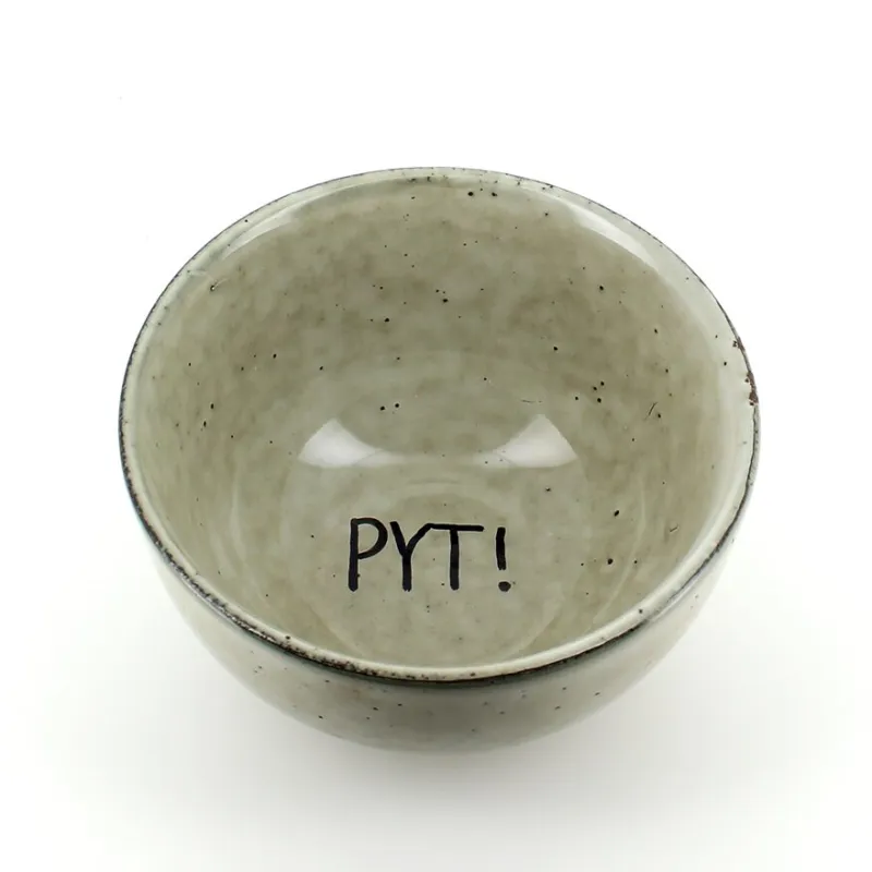 Med sin diskrete grå glasur og speckled tekstur tilføjer den en naturlig elegance til ethvert måltid. Indeni skålen er budskabet “PYT!” – et dansk udtryk for at lade bekymringerne gå og fokusere på det, der betyder noget – der fremstår tydeligt og inviterer til et øjeblik af mindfulness ved hver brug.
