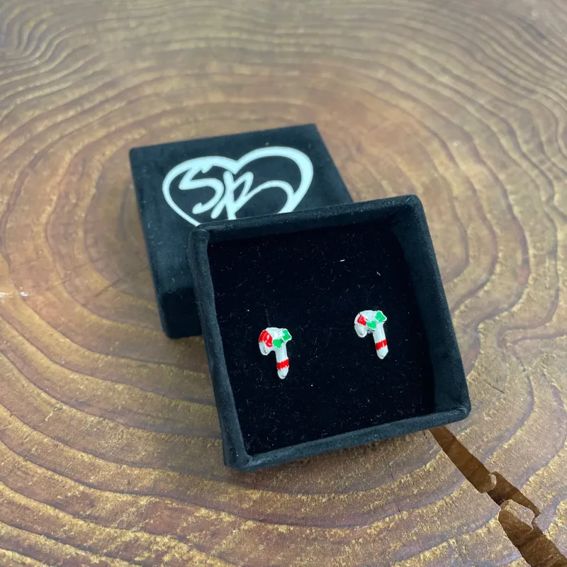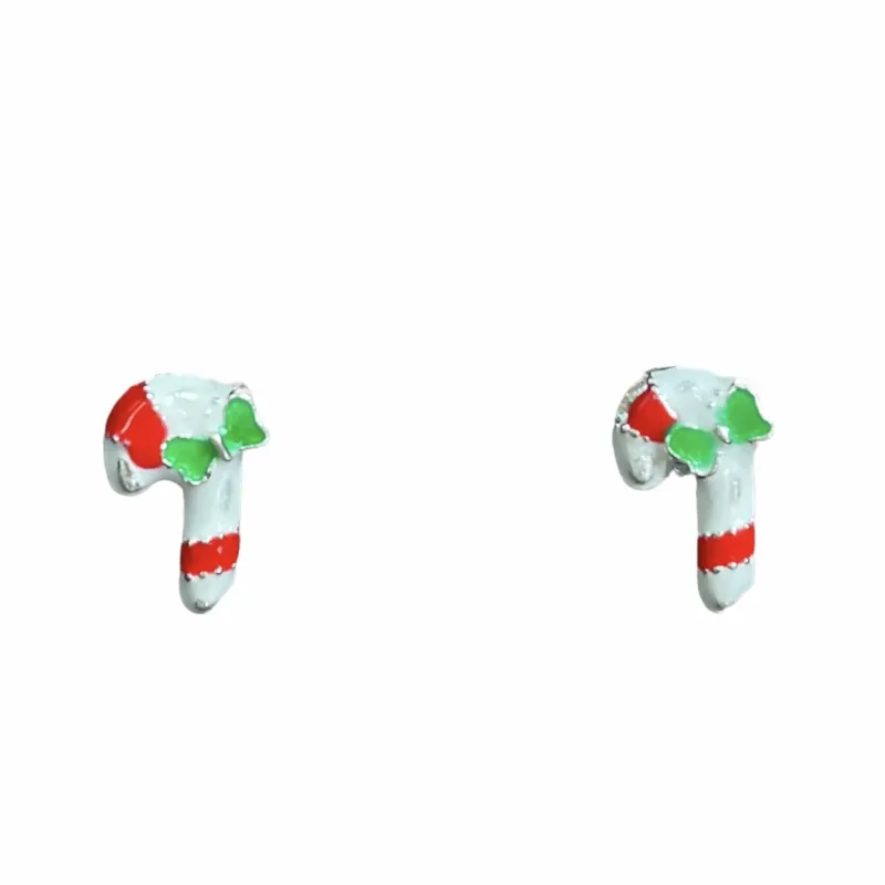 Søde julestok øreringe i sølvtone med røde, hvide og grønne detaljer.