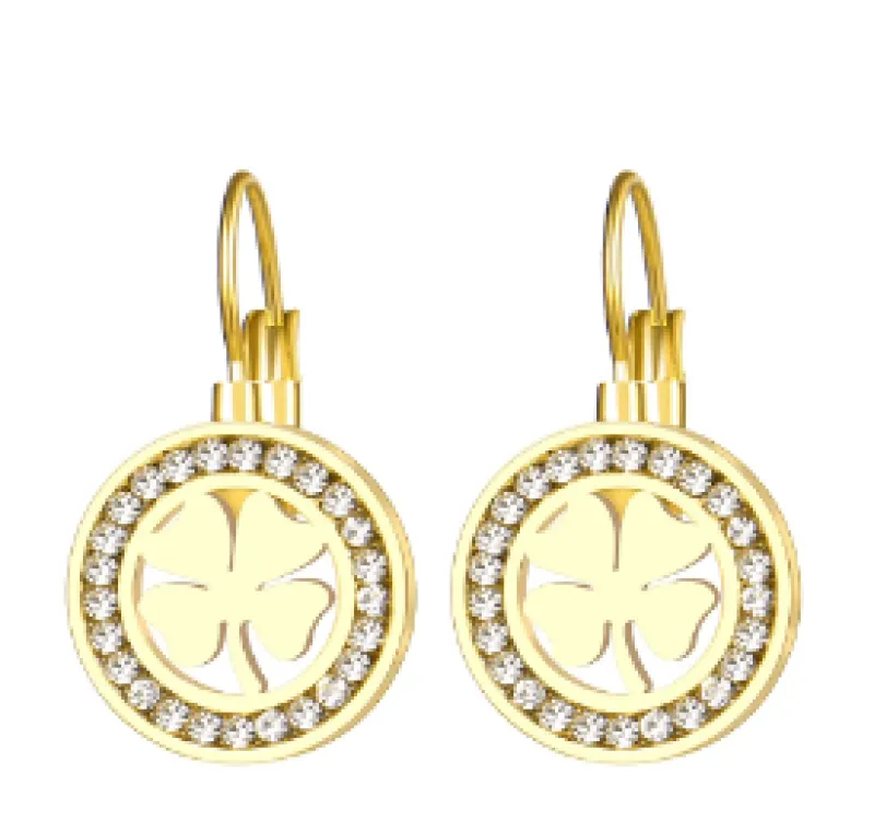Øreringe med kløver i guldtone. Søde små sten i en cirkel rundt om firkløveret.