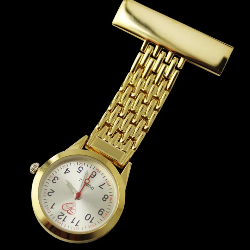 Guld tonet sygeplejeur med en bred lænke og stålfarvet urskive.