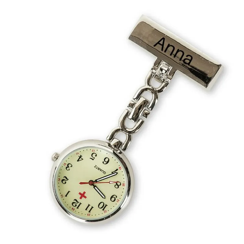Sygeplejeuret med kæde med gravering. Sygeplejeuret er i stål med valgfri gravering. Sygeplejebutikken anbefaler gravering af bogstaver max. 14 bogstaver.