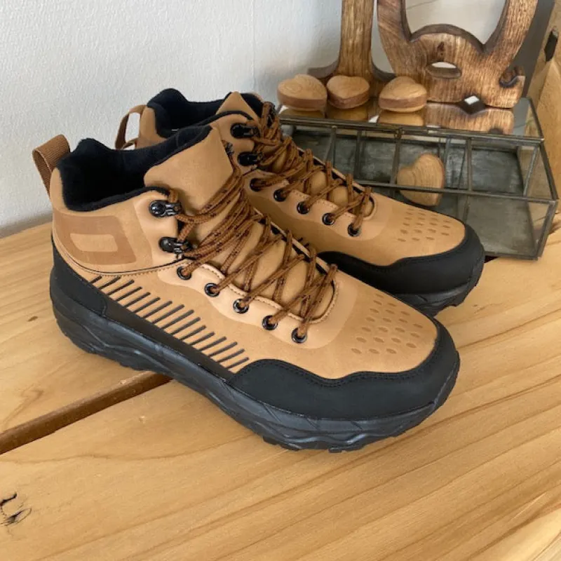 Stilfuld og praktisk herre ankelstøvle i lysebrun PU med moderne detaljer og kontrastfarvet sål.