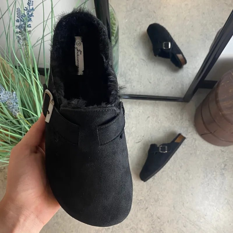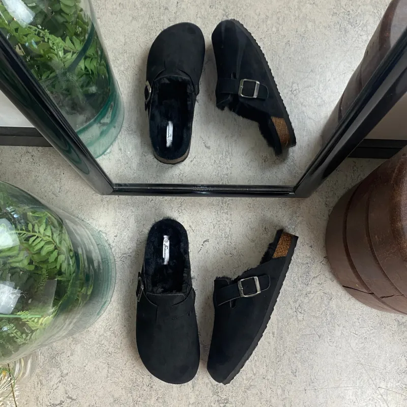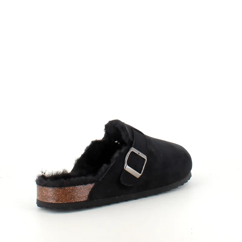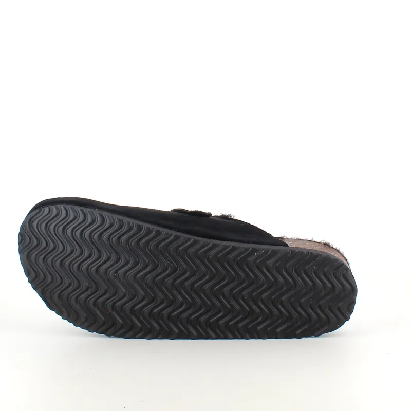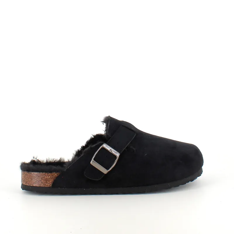 Sort Slip-on hjemmesko med en overdel i tekstil. Hjemmeskoen har en justerbar rem over forfoden Skoen er foret med blødt fleece for Mellemsålen er en korksål og ydersålen er en blød, rillet sål Sutskoen kommer i størrelserne 36-41