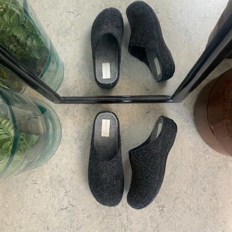 Mørkegrå filthjemmesko, som giver dig komfort og varme.