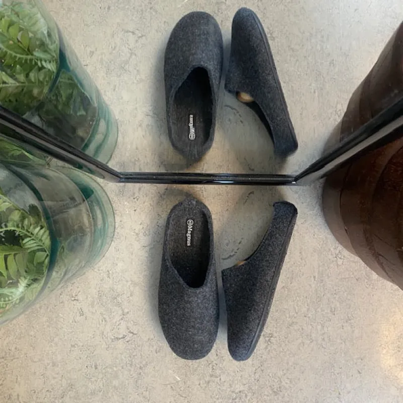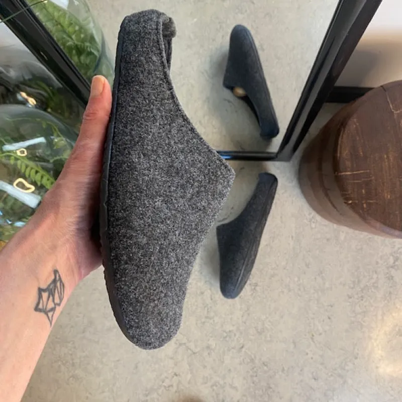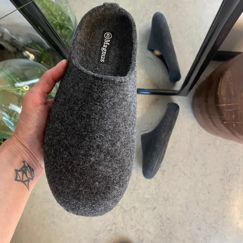 Mørkegrå filthjemmesko, som giver dig komfort og varme.
