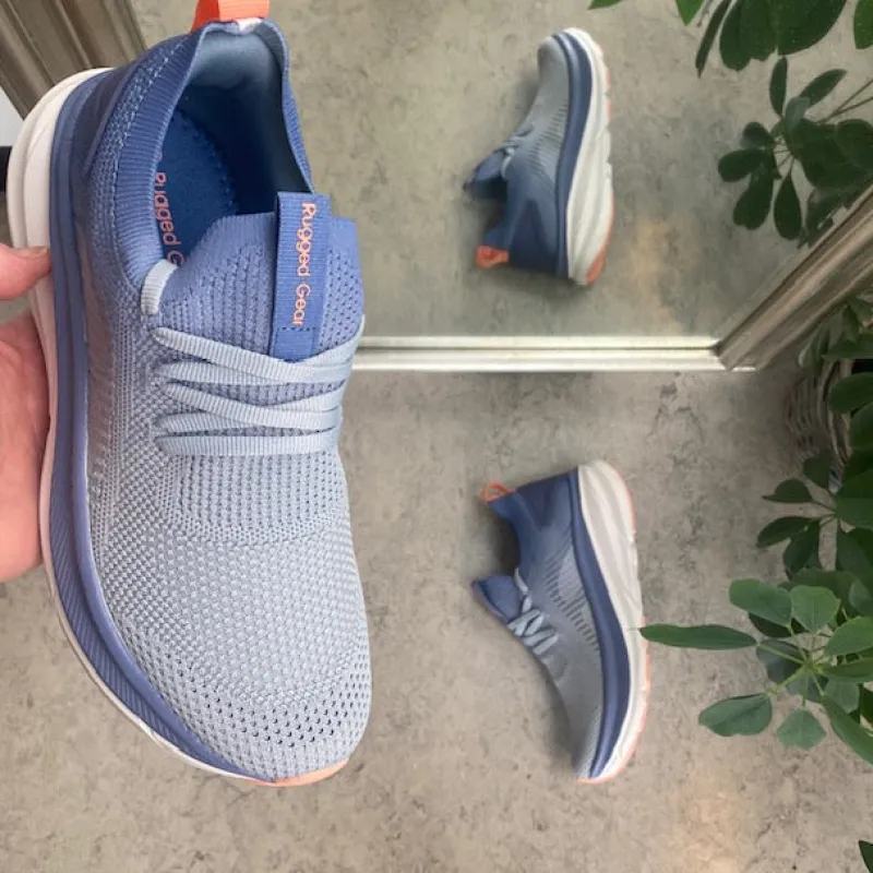 Lys blå sko med overdel i strikket mesh som sikre at dine fødder kan ånde. Skoen har elastisk slip on åbning og pynte snøre. Åbningen er ekstra foret, hvilket gør at skoen sidder godt fast om hælen. Indersålen er en blød skumsål. Mellemsålen har masser af stødabsorbering. Ydersålen har groft mønster som sikre et godt greb i underlaget. Skoen kommer i størrelse 36 – 41