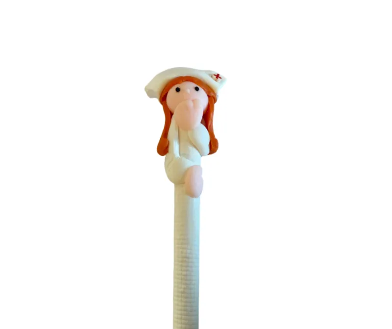 En sygeplejerske med hvid kappe og brunt hår , en pink med pink kappe, en i lilla, en i blå, en med hvid kappe og gult hår og en i gul.