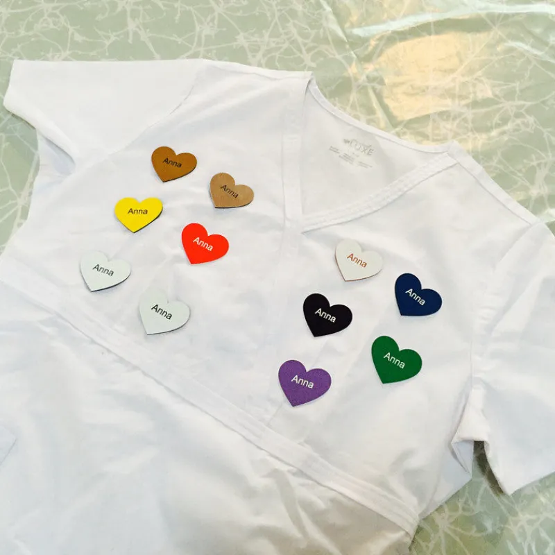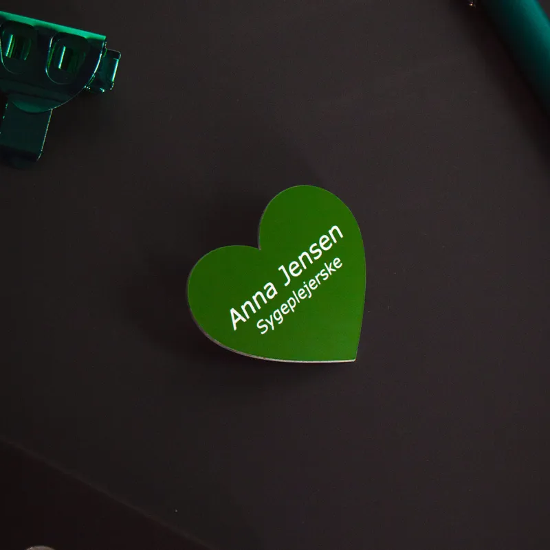 Navneskilt i hjerteformet med nål bagpå.