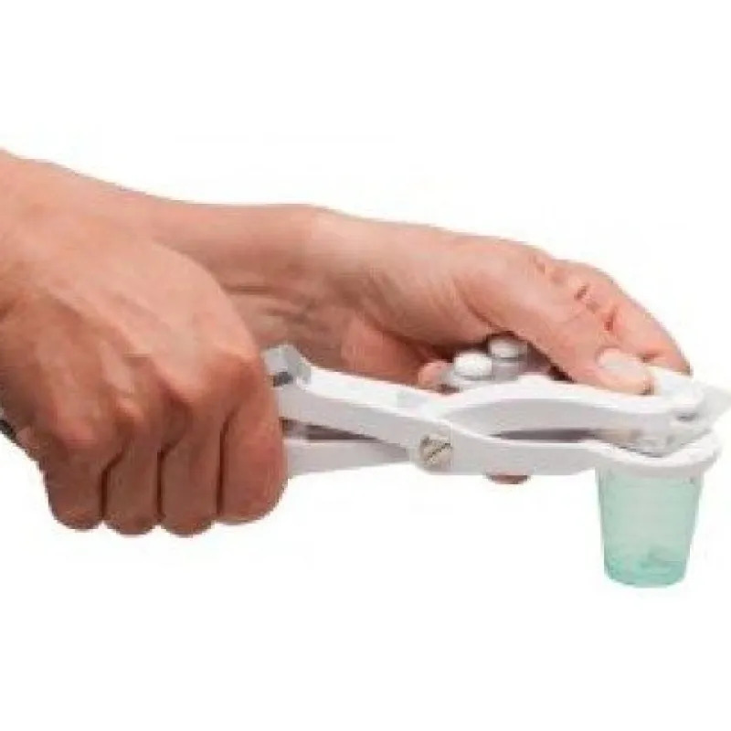 Tangen er både til venstre og højre hånd, kan bruges af en hånd. Placer den runde del under blisterpakken, med dækfolien nedad, tryk håndtagene sammen, og pillen falder ud.