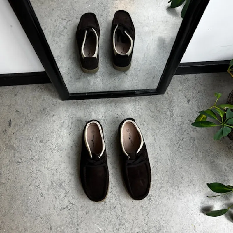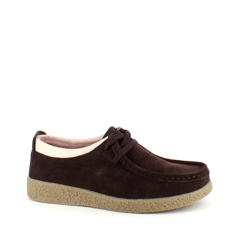 Brun ruskindsko med gummisål har en elegant design med en beige læderkant ved åbningen. Skoen har snørelukning og en tydelig syning i overdelen, som giver et stilfuldt udseende. Den indvendige skum sål er beklædt med læder for komfort, og modellen er almindelig med en bredde på 7.5 cm i størrelse 37. Ydersålen er lavet af rågummi, hvilket giver god stødabsorbering og fleksibilitet. Skoen fås i størrelserne 36-41 og i mange forskellige farver.