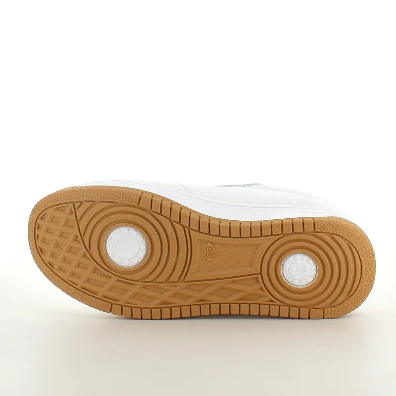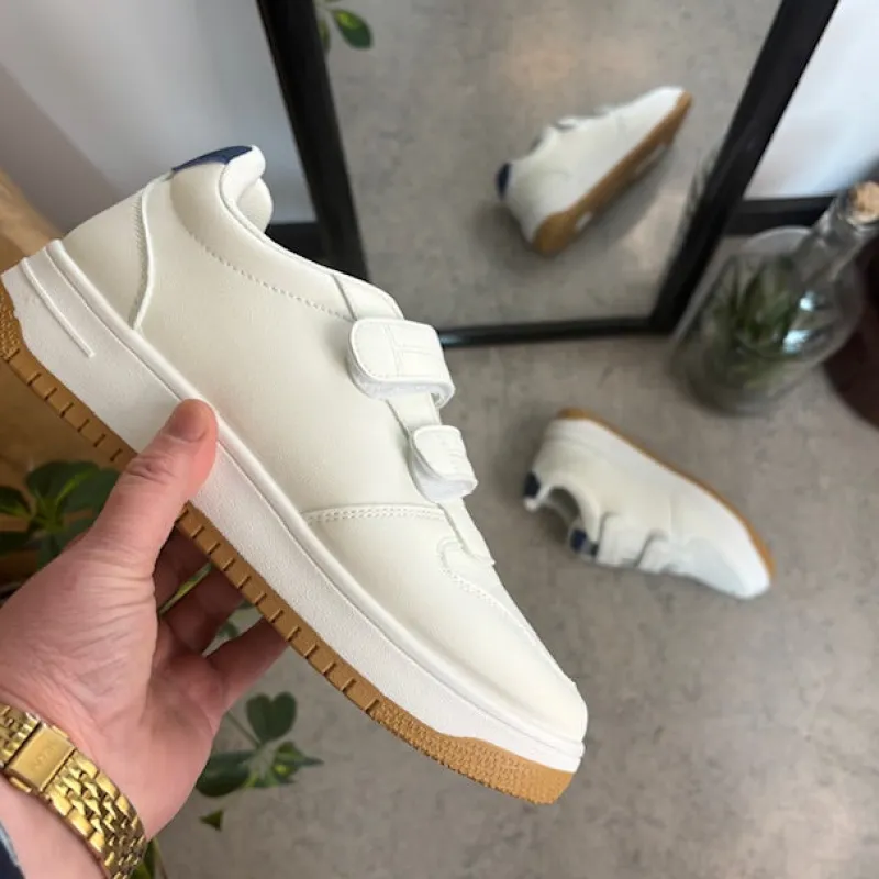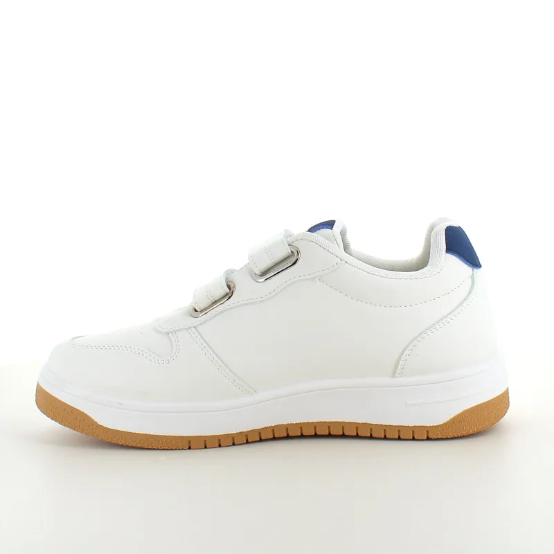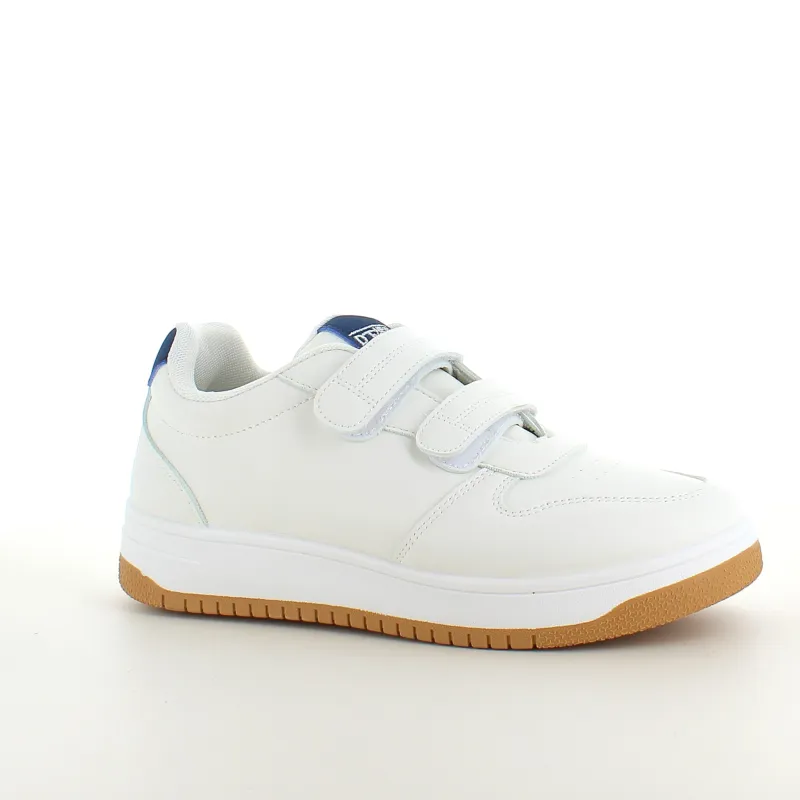 Klassisk hvid sko med en glat overflade som er nem at rengøre. Skoen har smarte blå detaljer både ved hælen.