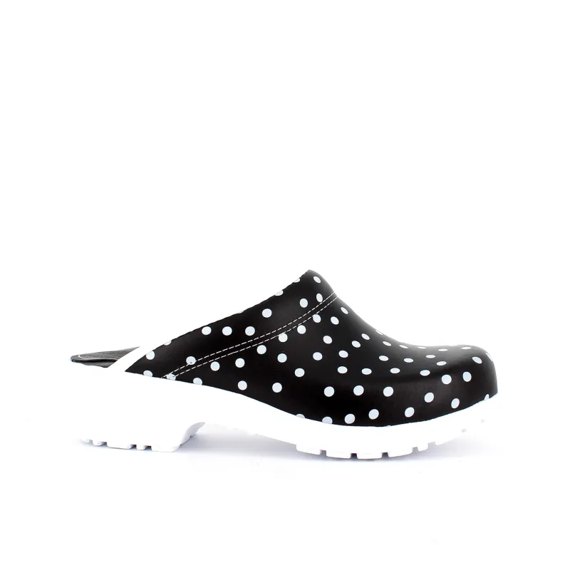 Sorte polkaprikkede træsko i dansk kvalitet.